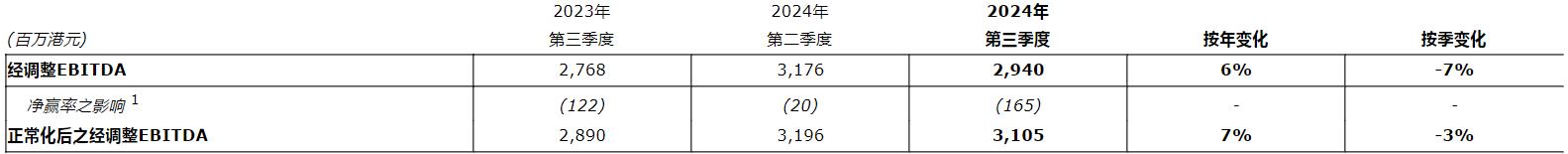 第三季度集团经调整EBITDA为29亿元,按年上升6%,按季下跌7%