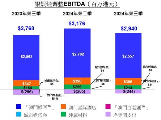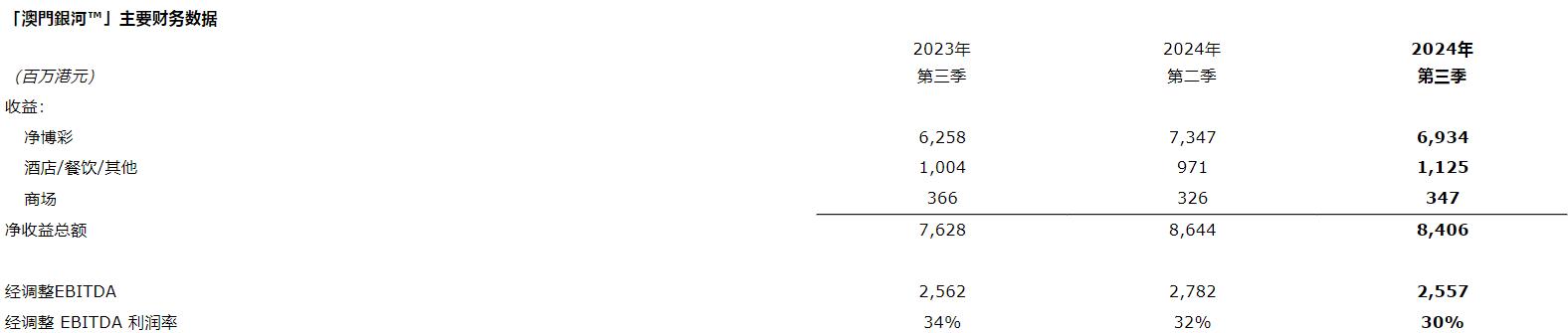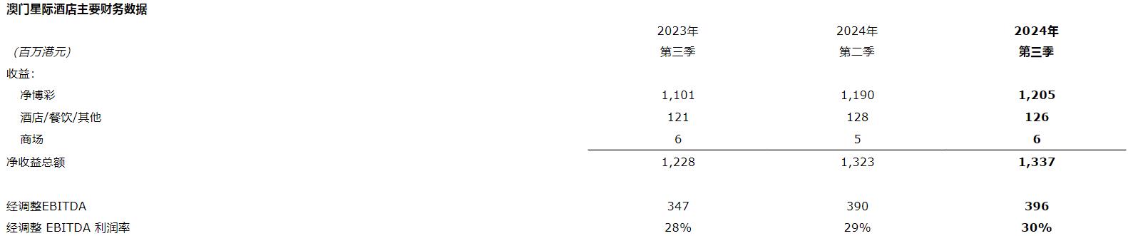 于2024年第三季度,澳门星际酒店录得净收益为13亿元,按年上升9%,按季上升1%。经调整EBITDA为3.96亿元,按年上升14%,按季上升2%。