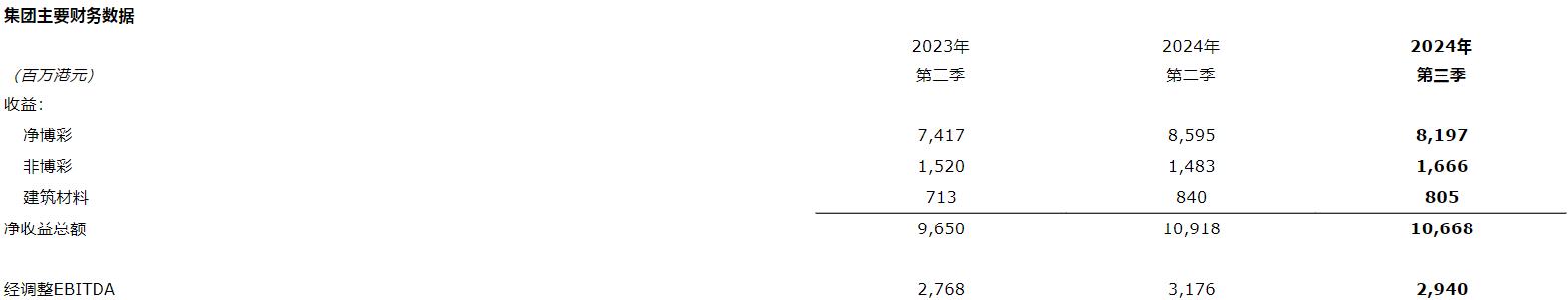 第三季度博彩业务净赢率偏高,令经调整EBITDA增加约1,500万元。净赢率正常化后,第三季度经调整EBITDA为3.81亿元,按年上升9%,按季上升7%