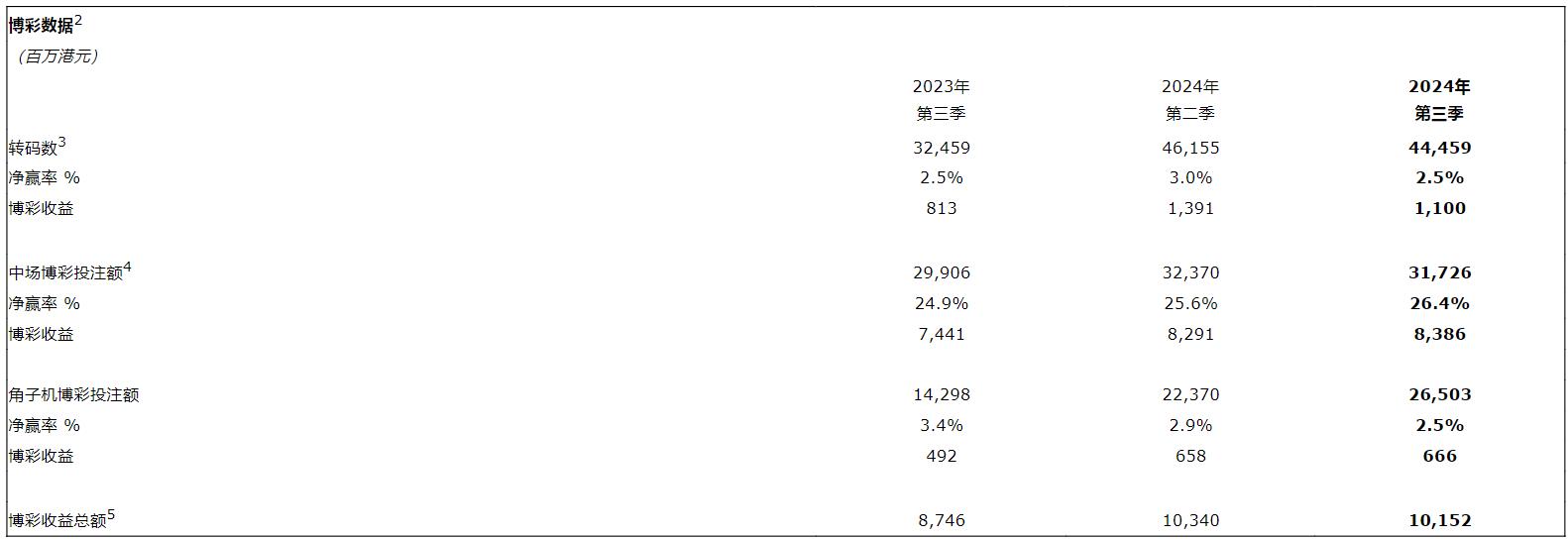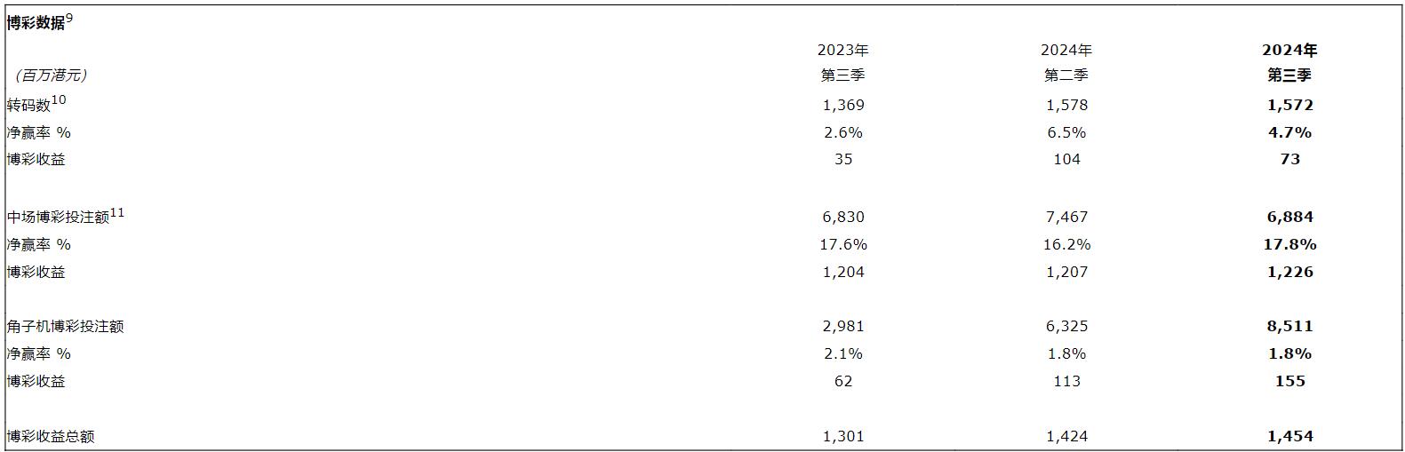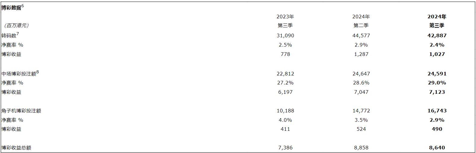 于2024年第三季度集团博彩收益总额为102亿元,按年上升16%,按季下跌2%。中场博彩收益总额为84亿元,按年上升13%,按季上升1%。贵宾厅博彩收益总额为11亿元,按年上升35%,按季下跌21%。角子机博彩收益总额为6.66亿元,按年上升35%,按季上升1%。