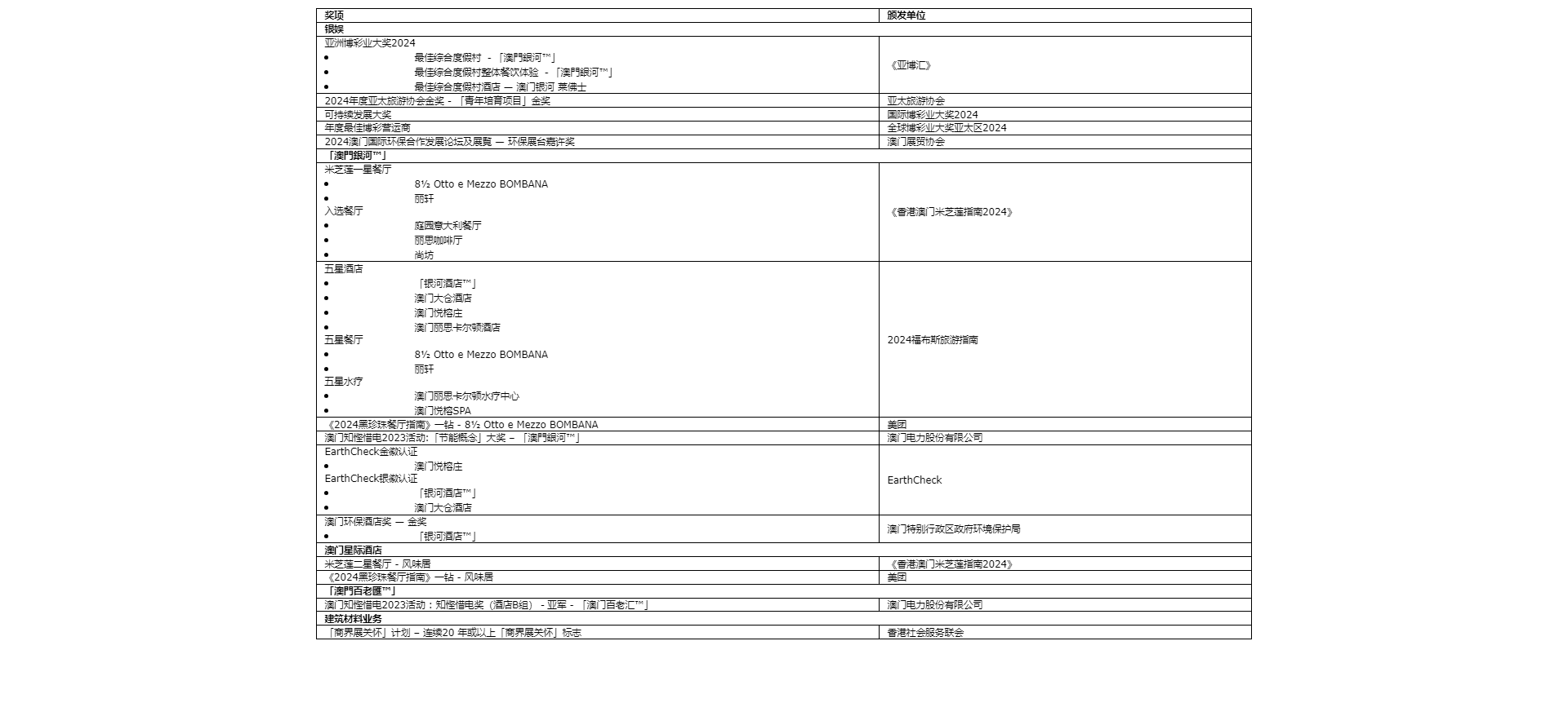 澳门博彩市场在2002年开放时,银娱透过其附属公司银河娱乐场股份有限公司为三家最初获得批给合同的营运商之一。于2022年,银娱获授予新的博彩批给合同,期限由2023年1月1日至2032年12月31日止。银娱一直以成功打造崭新、触目及屡获殊荣的项目、产品及服务见称,加上「傲视世界 情系亚洲」的服务理念,令集团的表现持续傲视澳门市场。